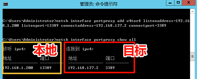 # Windows下端口转发,以实现远程端口3389为例 ## 场景如下 先说明一下场景 服务器A处于局域网环境内,IP为`192.168.1.200`(同时作为虚拟机B的网关`192.168.137.1`) 服务器A中安装有不同网段的虚拟机B,IP为`192.168.137.2`。 A可实现对B的远程,但A同网段的其他机器无法ping通B  开始实现 ## 方式一:CMD Windows自带端口转发 > 如何在Windows中使用netsh命令进行端口转发  > netsh interface portproxy支持windows xp(含)以上,依赖于IP Helper服务 在服务器A执行如下CMD命令,建立端口转发规则`192.168.1.200:13389 ==> 192.168.137.2:3389` ### 语法 ```bash # 语法 # netsh interface portproxy add v4tov4 listenport=[监听端口号] listenaddress=[本地IP地址] connectport=[目标端口号] connectaddress=[目标IP地址] netsh interface portproxy add v4tov4 listenaddress=192.168.1.200 listenport=13389 connectaddress=192.168.137.2 connectport=3389 # 同上 netsh interface portproxy add v4tov4 listenport=13389 connectaddress=192.168.137.2 connectport=3389 ``` 执行完毕,可通过远程访问`192.168.1.200:13389`实现对`192.168.137.2`的远程访问。  与此同时 ### 代理举例 ```bash # 数据库端口转发 netsh interface portproxy add v4tov4 listenport=3307 connectport=3306 connectaddress=192.168.1.100 # SSH 端口转发 netsh interface portproxy add v4tov4 listenport=2222 connectport=22 connectaddress=192.168.1.102 # Web服务器端口转发 netsh interface portproxy add v4tov4 listenport=80 connectport=8080 connectaddress=192.168.1.103 # FTP服务器端口转发 netsh interface portproxy add v4tov4 listenport=2121 connectport=21 connectaddress=192.168.1.104 ``` ### 查看本机添加的所有规则 ```bash netsh interface portproxy show all ``` ### 删除指定规则 ```bash netsh interface portproxy delete v4tov4 listenaddress=192.168.1.200 listenport=13389 ``` ### 删除全部规则 ```bash netsh interface portproxy reset ``` ### 导出备份规则 ```bash netsh interface portproxy dump > c:\portproxy.txt ``` ### 导入还原规则 ```bash netsh -f c:\portproxy.txt ``` ### [Netsh interface portproxy 命令](https://learn.microsoft.com/zh-cn/windows-server/networking/technologies/netsh/netsh-interface-portproxy) ## 方式二:Windows下使用NGINX实现端口转发 在服务器配置NGINX,配置文件添加如下配置项: ```bash stream { upstream mstsc { server 192.168.137.2:3389; } server { listen 33389; proxy_pass mstsc; } } ``` 启动NGINX后,可通过远程访问`192.168.1.200:33389`实现对`192.168.137.2`的远程访问。 ## 扩展 - 同理,可使用同样的操作添加实现对其他端口的转发规则。 - 如果无法访问请取人防火墙是否开启对应规则和端口或被安全软件拦截