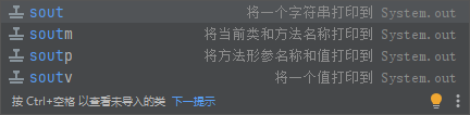 # IntelliJ IDEA输出打印System.out.println()的快捷键 ## 快捷键:sout ## 原文 在eclipse中习惯了使用syso,开始用idea很不习惯。 在idea中直接输入`sout`,自动出现提示,不像eclipse中那样还要`alt+/`,这算是idea的一个优点了。 sout 看图:  按Tab或Enter都可以出现  ## 其他 - sout - 将一个字符串打印到System.out - soutm - 将当前类和方法名称打印到System.out - soutp - 将方法形参名称和值打印到System.out - soutv - 将一个值打印到System.out ## 快照 - https://pic.rmb.bdstatic.com/bjh/241021/4de1045c9f91361b8f71e0fc30fcb3cc9874.png - https://i3.wp.com/pic.rmb.bdstatic.com/bjh/241021/4de1045c9f91361b8f71e0fc30fcb3cc9874.png - https://youyong.nobige.cn/snapshot?p=dcc1982d400ff6af446a2c74c8a4ef4f&u=https://pic.rmb.bdstatic.com/bjh/241021/4de1045c9f91361b8f71e0fc30fcb3cc9874.png