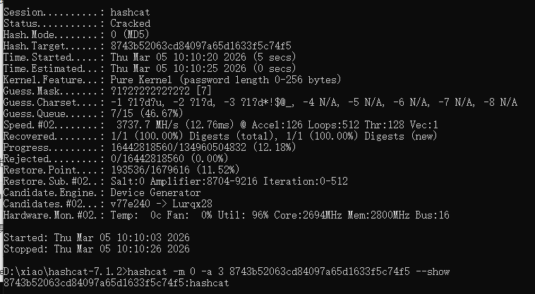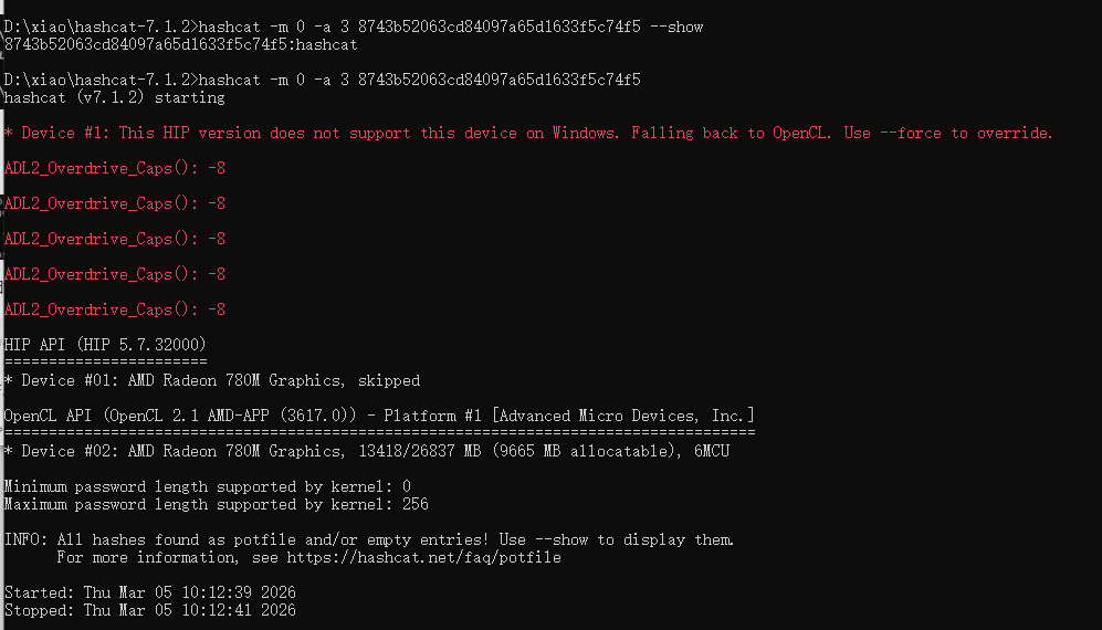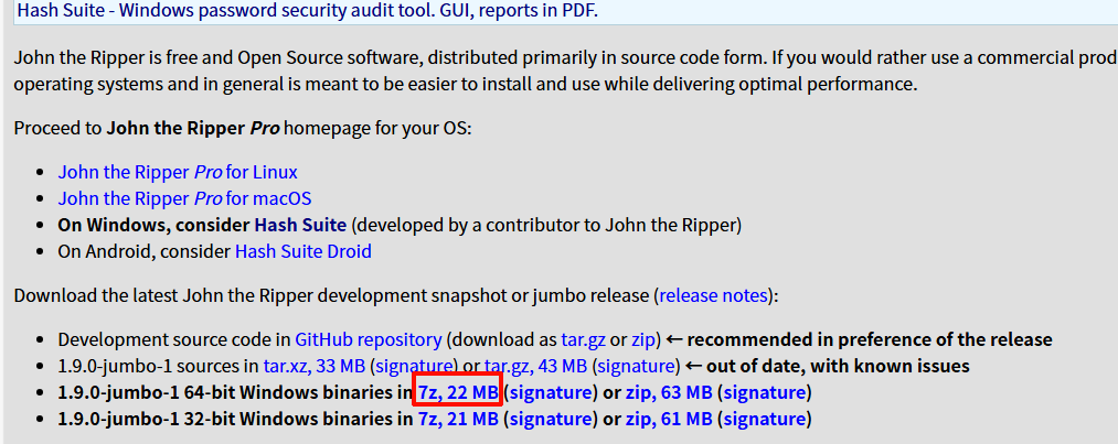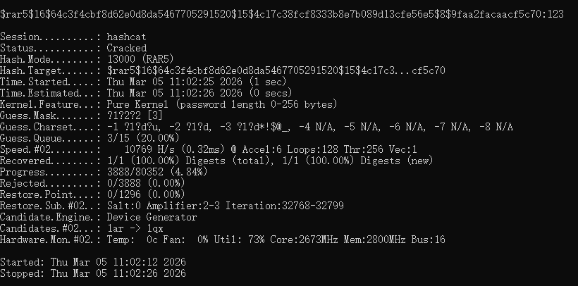 # 如何使用 hashcat 破解 RAR、ZIP 压缩包密码 > 本文介绍了如何使用 Hashcat 和 John the Ripper 这两个工具来破解 RAR、ZIP 压缩包密码 > 参考链接: > > 轻松搞定 RAR、Zip 压缩包密码!Hashcat +john the ripper 亲测好用!:[https://www.freedidi.com/2655.html](https://www.freedidi.com/2655.html) > > John the Ripper:[https://www.openwall.com/john/](https://www.openwall.com/john/) > > hashcat:[https://hashcat.net/hashcat/](https://hashcat.net/hashcat/) **免责声明:本文所讲内容仅供学习使用,请勿用于违法用途!如用于违法用途,请自行承担后果,与本文、本人无关!** ## 前言 最近在网上找资源的时候下载到一份加密的 RAR 压缩包,看到无良搬运工加个密就开始捞钱,作为一个程序猿,这怎么能忍? 既然不想掏钱,那当然要用程序猿的办法——暴力破解了。 而本文要讲述的 hashcat ,就是这样一个密码破解工具。 安装 -------------- ### 1. 安装 hashcat 首先,从 [hashcat](https://hashcat.net/hashcat/) 官网下载安装包,解压缩后放在合适的文件夹下。 这里直接下载二进制版就可以了。  这里以 D 盘为例。  调起命令行控制台,切换到该目录,运行 能正确输出版本即为安装成功。  接下来从官网找个例子,测试一下是否能正确运行。 这里以 MD5 为例。 https://hashcat.net/wiki/doku.php?id=example_hashes  在控制台中输入 ``` hashcat -m 0-a 3 8743b52063cd84097a65d1633f5c74f5 ``` 如果一切正常,你将在控制台看到  冒号后面的就是破解结果,是`hashcat`,和官网给出的答案一致。 注意: * 如果你再次执行该命令,会得到如下结果:`INFO: All hashes found as potfile and/or empty entries! Use --show to display them.`  此时将命令改为: ``` hashcat -m 0 -a 3 8743b52063cd84097a65d1633f5c74f5 --show ``` 就能看到曾经破解过的 hash 了。  * 如果你在 PowerShell 或 Shell 中执行命令,需要注意`$`的转义,在默认情况下,$ 符号被用于引用环境变量,可能会造成执行结果错误 此时只需要用单引号`''`将 hash 括起来即可。 ``` hashcat.exe -m 13000 -w 4 -a 3 '$rar5$16$b88c1d7d2c96dc9d1b1a5ccdc5c25d50$15$8f0b287c982535c868bbff486ee9acd2$8$43907bfa03430471' ``` 可以看到,执行成功了,*新版+win10不需要*  ### 2. 安装 John the Ripper 看完上面的例子,读者朋友肯定会有个问题,那就是用来破解的 hash 是从哪来的? 如果是类似 MD5、SHA1 这类纯文本,那么算法的结果直接就是用来破解的 hash,而如果是 RAR、ZIP 等压缩包,就需要借助 `John the Ripper`这个工具来获取 hash 了。 同样是通过官网获取到安装压缩包:[https://www.openwall.com/john/](https://www.openwall.com/john/)  解压到合适目录,这里同样以 D 盘为例  注意,可执行文件在 `run`目录下。可考虑将该目录加入环境变量,方便后续操作。  然后,将需要破解的 RAR 压缩包放在**没有空格**的路径下(包括文件名),经过实际测试,`John the Ripper`是支持路径中有中文字符的,但不支持有空格,所以可以把要破解的压缩包改个名字,然后再破解。 实战演示 -------------------- 这里以 E 盘下面的`README.rar`和`README.zip`文件为例,我设置了密码为`1234567890`,稍后来演示如何破解。  首先执行如下命令来获取到 hash 值 ```bash D:\xiao\john-1.9.0-jumbo-1-win64\run>zip2john.exe ../README.zip README.zip/README.md:$zip2$*0*3*0*f72a9af5124feaef487a4da9a364f1da*a036*cde*fb72204b548c9793c1ba6c50856ff7845ac5c10851a0d79355d07df362e5aba52297bbaa3f1e0eb0b757489532074adbf0fc47c4b6e542de0702567c92025be2840d964ca65f6570b7197050e12187d2f5c75a639b91ce7be5ad25659a5462824e99d475727e3795e58c8e2df392325f2b08443764aacd2eabb66a0687588996e109d61d2d178fdbbc6cdf8cba48d163c8431ba073442b63b115178f2416855a465896fac03d920714788dd1b367f561691629172b85bc79422e5e17a695ebcefd7c1c7606150e3234262dd7efd1d1bf622c09931b3e6c93edceb8b045c6ce47c3eb8e13030305fe9599653dfa7fee2c4bb3f597d367d1df12e36615c7829220d6a2cba9cccc977652088910c2c5f0213b9d1226c479f536c193e119c1c4fc0502540234bba4fc75b3bfd43e609ecb94d90a75d6419d1fd68c0f6c215402b4b7dbecbe8aea6475303e67f4df32503565d4602aa209eb29ed9c4fa38ecb5023ff2b4feb6abb032b30c78257440f9d633a5709829089861b2170443785ba0b6ad0c81cafa541365af72cf3e194f5448e6b5ec7bc51ffe8024c8cdb052cd7ca21e1fd9e4efe56742b5221d10a355fb648a59ab9866cb7cd6736538b09fdec7f81aff9fec31b2d967e998df242bd7d09c485d96965bf56910ca7d637a45fe378f4ca268251729cd4582abbceacfc3240b4a559d11d1f6a06bb1330fc8330cc416ff65e570d448b22210b6f7e0874d1acd4bdd0cb793092f13ad0c1257972c7737dee1fc78575fff274a16a9ea9764544d6f5258750aaa5797ea674ce2a918ab5e4299efa759ed560159321e464ee534f316d376bb0e03ab8fc7ca103732711c7fafb24892e0cc7450733101e967a5f57c734eb769fdb136f26d45fa59e4a42943e885c8de7316001867a62a7d5fc025af91b91f81d0c5218744e4861213e2fb3e4c089e062a431ea3474f734141c4b2a6be82b152f9e2015b6bdc91866607b9f85060f0aef81bf743b62a22604277dd9a66ed9d2510efcb9cbe6c771de0274521b21a88bb71a8b9a5f781c1181547b2dd230eaaa5e938e0d8e869bfc6798109dda760d3788f9be665272bd52d6cf2428dbf57fdddbf1d45318a72ccba2fcc2efdbfcd42b5a19a0dac38fabe3ab1819160c684a999d21ef454b21c707366044e1eeaea5478086631abd03102b0dc6bcc4cb43d71b5a066041e677a08a516c25cfef7a32246d74b66cafca3bf416d398fafdf40118d6cd1458b69cbe2a1c16e3a18081f33adf870331d4e74f696601d6902157fae32e8057cf34ed72f3caff358493f0576f1d06c9420335e21048a52cb58e40c28fad25f962f8aaa78bd732c91ebb9dde841096bb69d27df0008717ff57cfe462b6d076afe0878e4365c7f1e8c2b76899be9ff884222230e81f9ed46c5414b0424f0aeec03890ef9d94e45050df9a929822eb807a20a8d34136ebf38f37131a4263ca3afee27b28da5c31fd8206b194233196e50468f074ba3ef390075a01ea62d629812aa31d3f6a3c997f4a688947852228b0818d4ab0a5473947bbe9bc7947d98fce3c1e92542bab2e822773f09fdc54ebb532bbaa29ea65f05764c4963e90eb0eab87c1acbad788f8e97aec3098911560db4fade8d3bc0b9a2f1f54506362713f43d3fd48b560264a7eaac4682319a46c7644322118385cb2c407576b6a4848d9a52100e8bf66ddc74cb5bc49b249ea7c90333f8ed7b